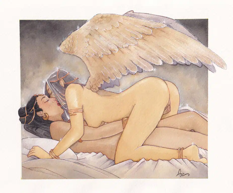 J’ai peint cette aquarelle érotique en utilisant une palette de couleurs assez proche du travail de Luis Royo, dont j’adore les ambiances. J’ai beaucoup aimé faire en sorte que les personnages, en particulier l’être céleste, débordent des limites de la scène.