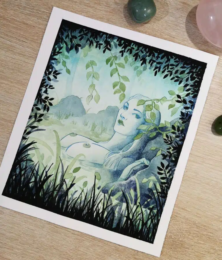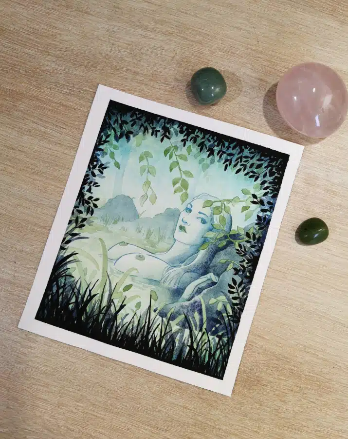 Si tu le peux, je te conseille de faire faire un passe-partout sur mesure pour cette jolie ondine. Des magasins comme Le Géant des Beaux-Arts proposent ce service pour un prix raisonnable. Un encadreur t’en fabriquera un sur mesure également. Le passe-partout protège l’aquarelle du contact direct avec le verre du cadre et fait ressortir les couleurs de la peinture.