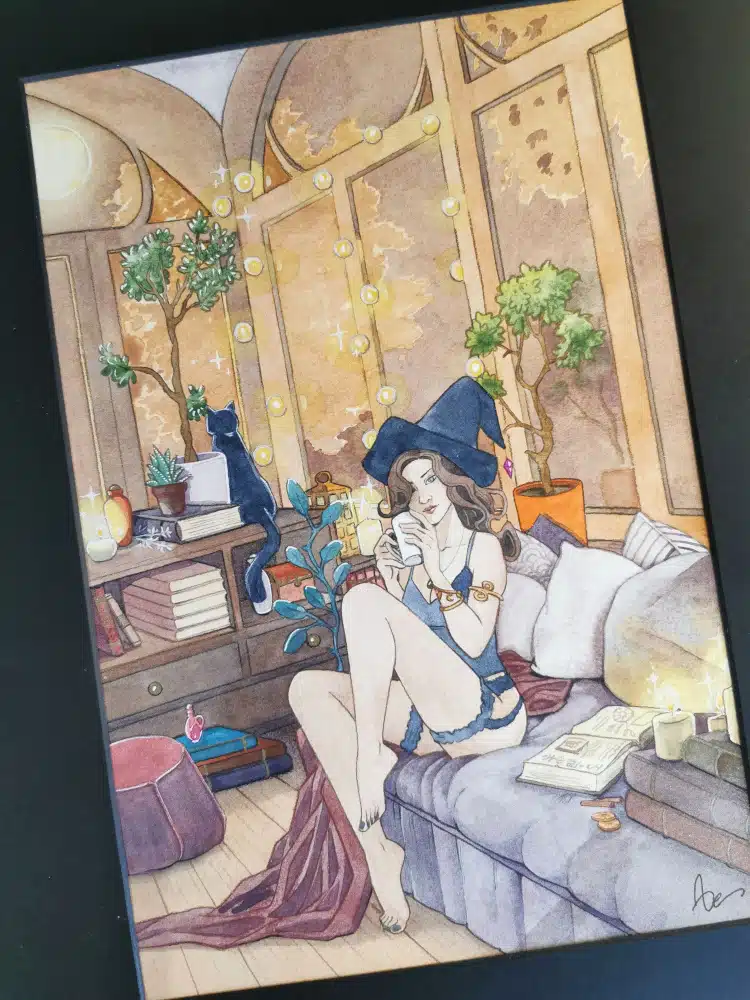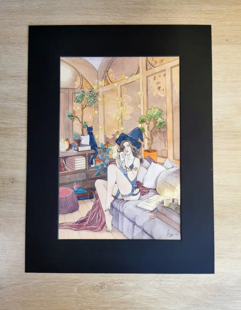 J’ai déjà installé La sorcière cosy dans un passe-partout noir pour la protéger et la mettre en valeur. Il te reste juste à lui trouver un cadre de 30 cm x 40 cm. Du noir lui ira très bien au teint.
